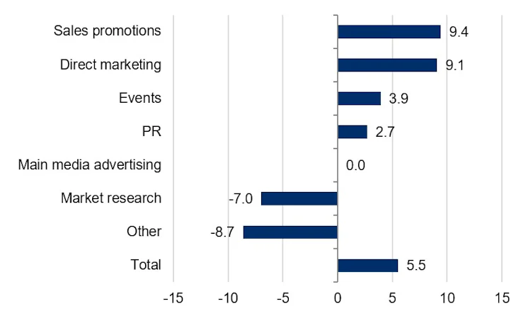 Meanwhile, main media budgets, often considered essential for brand building, remained flat, following two quarters of decline. The net balance held steady at 0.0%, following a -6.7% reading in Q1.