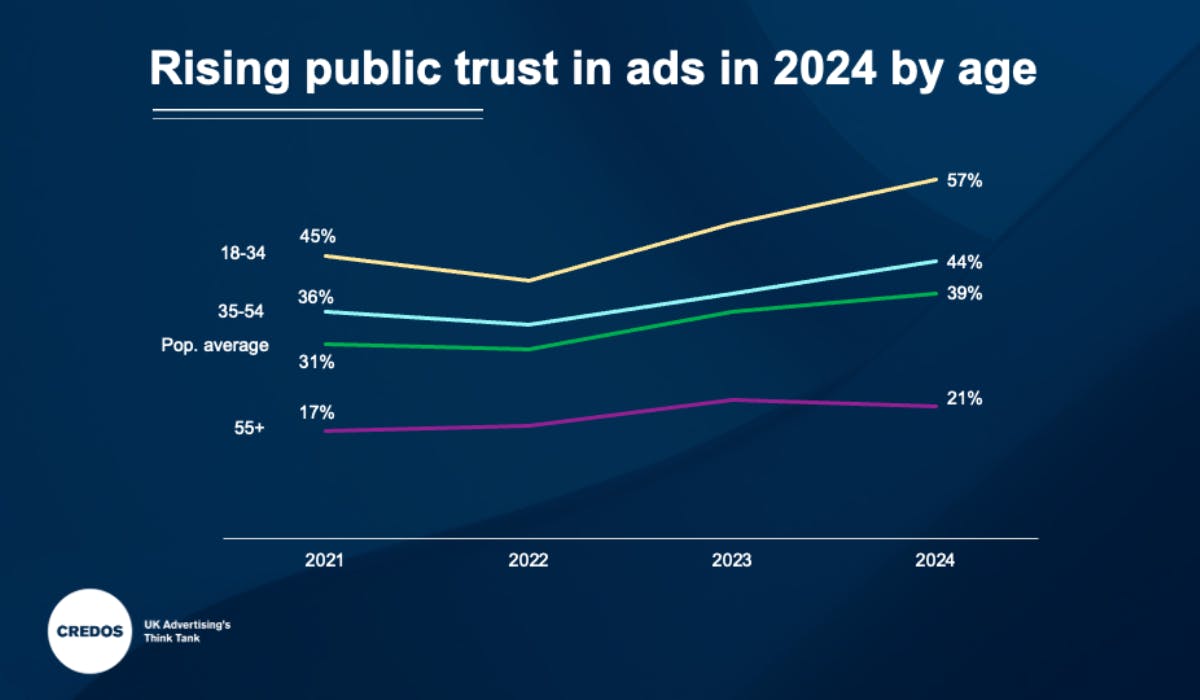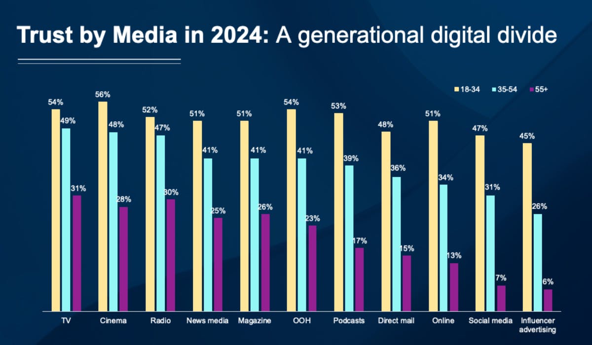 UK advertising think tank Credos attributes this trust gap to a “generational digital divide”. Younger audiences increasingly trust online advertising, while trust among older generations remains low.