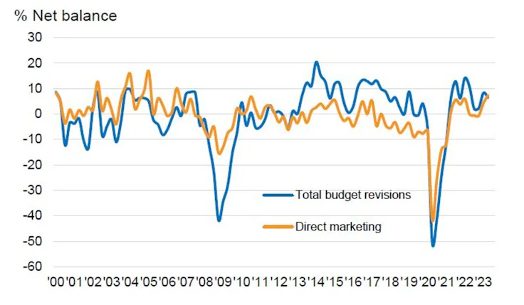 Just 11.3% of respondents report cutting budgets in the period, with 18.5% stating they increased them, resulting in the positive net balance. This surge represents the strongest upward revision to direct marketing budgets since the third quarter of 2006. By comparison, the first quarter of 2023 saw a net balance of 4.2% of respondents upwardly revise direct marketing spend.