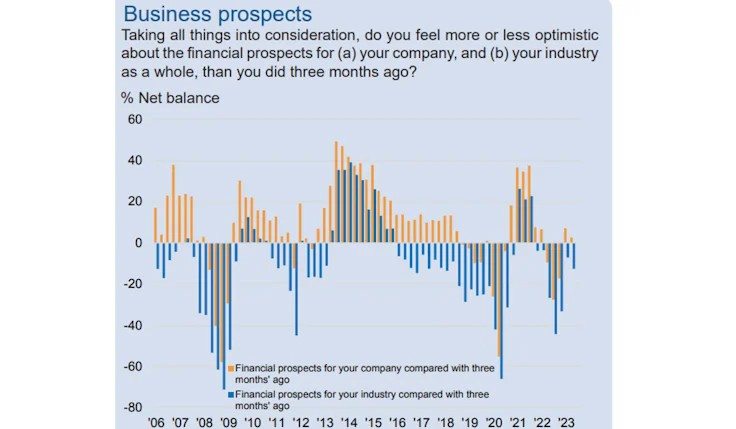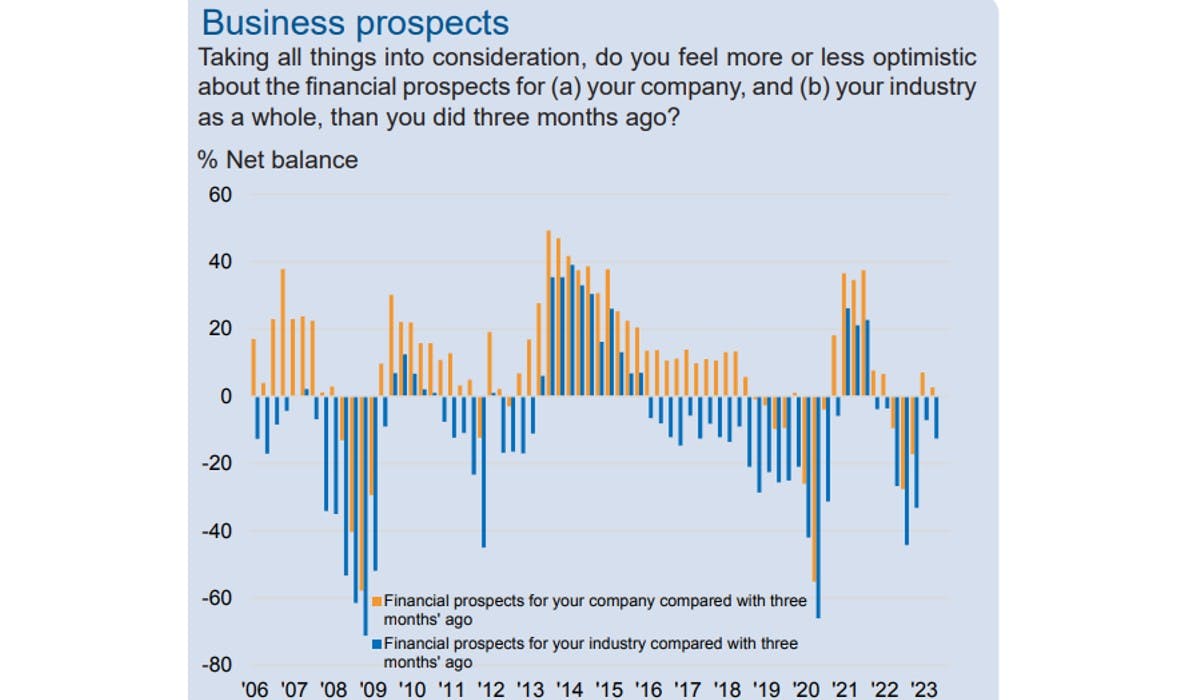 Respondents were also less optimistic about their own prospects, with a net balance of just 2.6%, with respondents almost evenly split between optimism and pessimism. In the first quarter of the year, a net balance of 7% were optimistic about their company-own prospects.