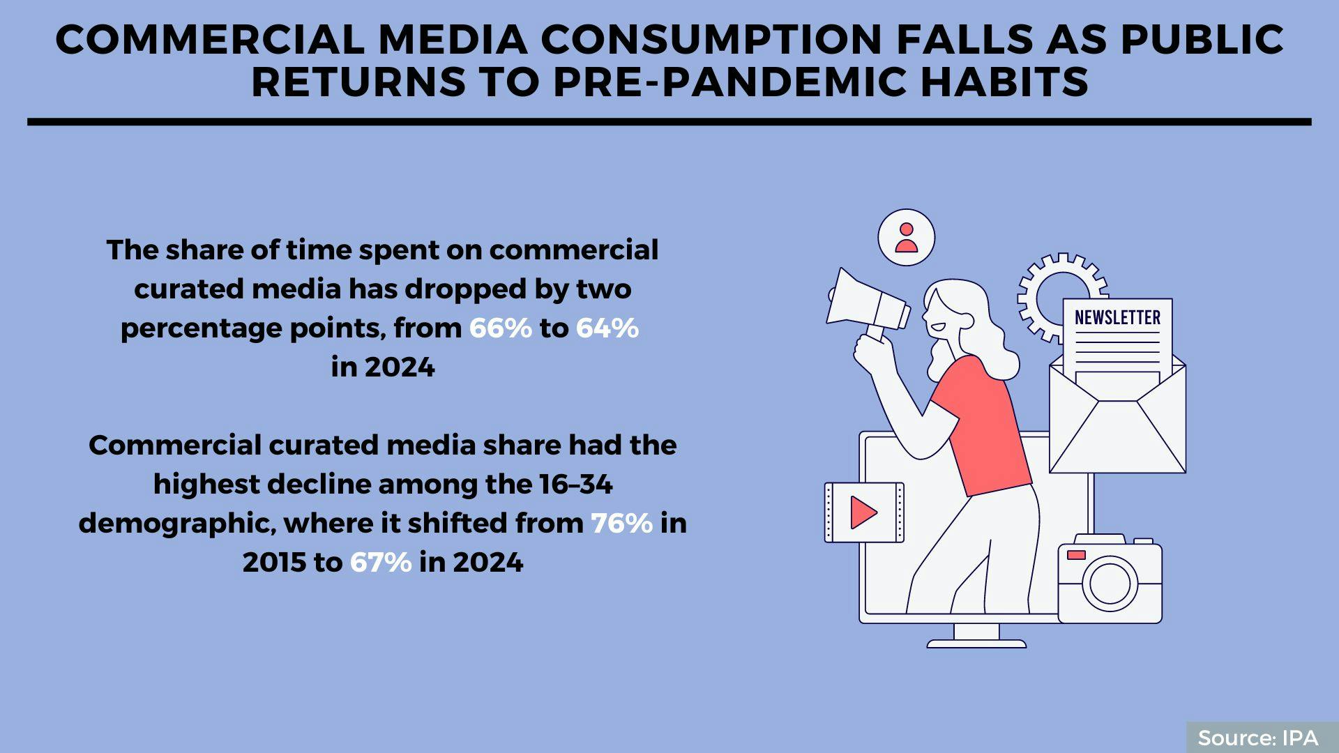 According to IPA’s 2024 Making Sense report, which tracks how commercial media consumption has shifted since 2015, the share of time spent on commercial curated media has dropped by two percentage points, from 66% to 64% in 2024.