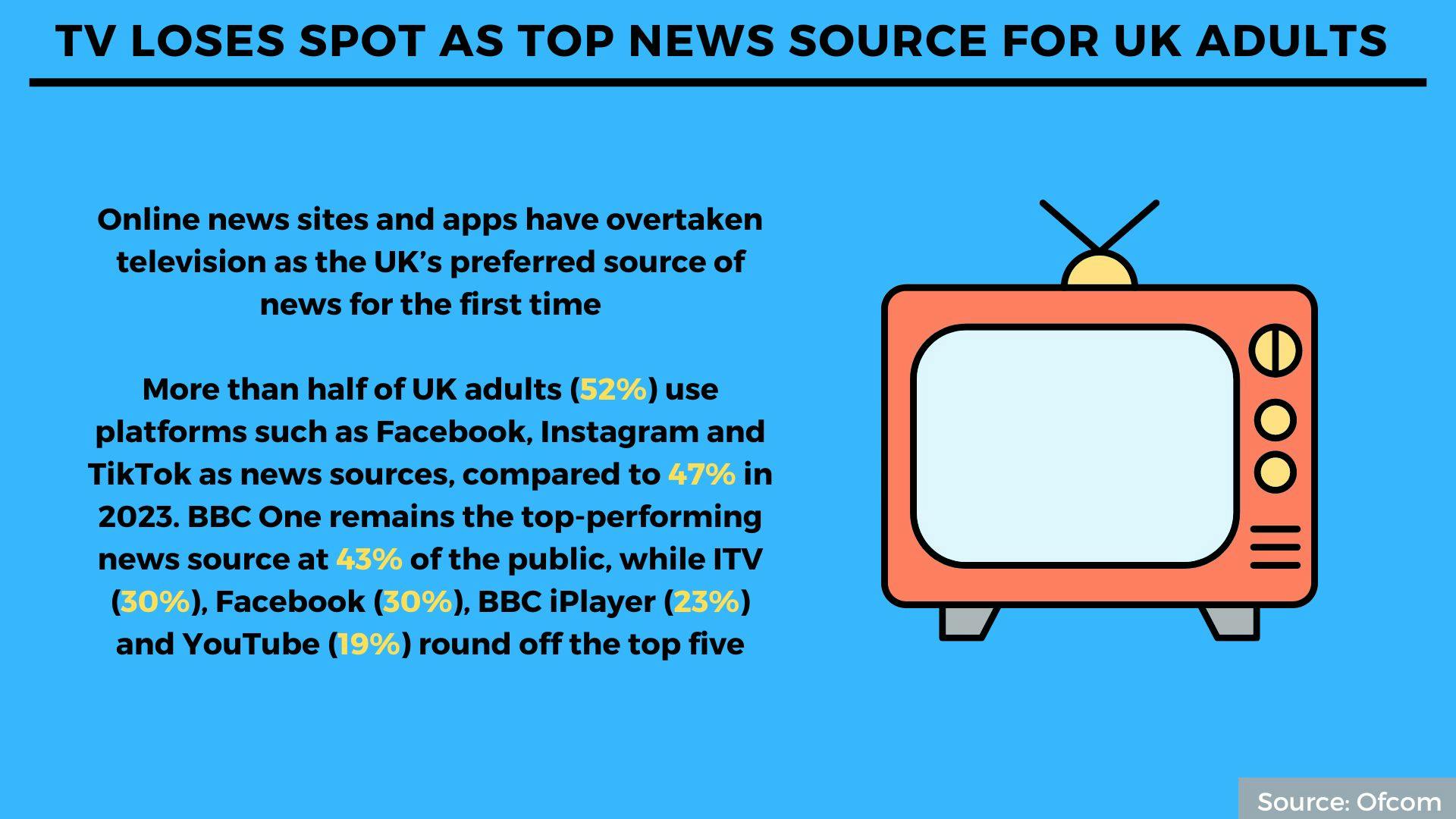 Ofcom points to the increasing use of social media as a news source as being a key driver of this change. More than half of UK adults (52%) use platforms such as Facebook, Instagram and TikTok as news sources, compared to 47% in 2023.