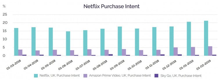 YouGov’s research indicates that UK consumers’ purchase intent for Netflix is on the rise, and is consistently around four times higher than for Amazon Prime Video, while Sky Go trails even further behind.