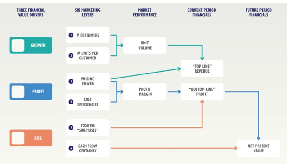 Together, these six dimensions represent the six levers of marketing value. The relationship of these six levers to revenue and profit generation, and then to valuation, can be illustrated as follows: