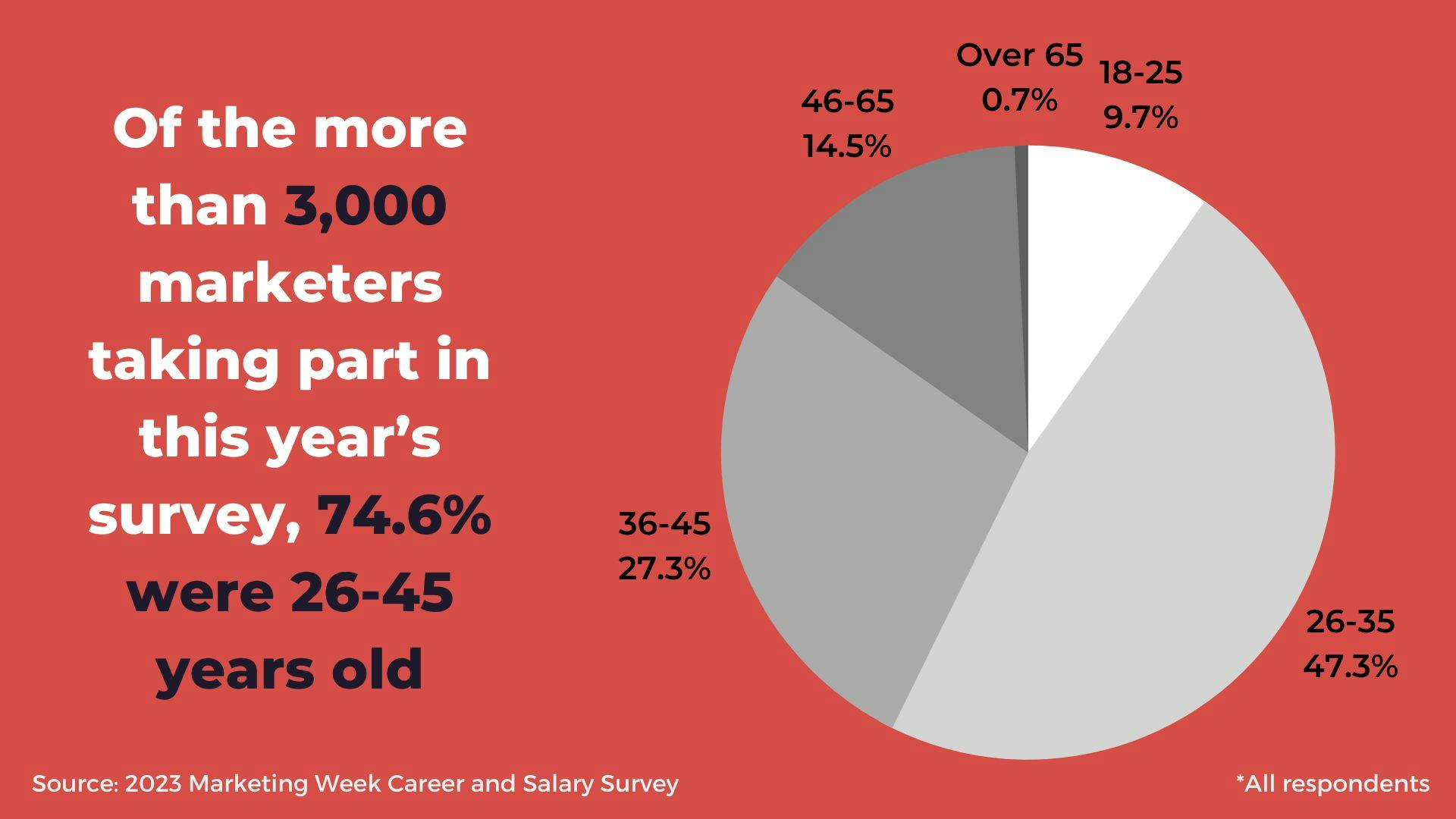 Of the more than 3,000 marketers taking part in this year’s survey, almost three quarters (74.6%) were aged between 26 and 45-years-old. Breaking this statistic down further, almost half (47.3%) are aged 26 to 35, while more than a quarter (27.3%) are aged between 36 and 45-years-old.