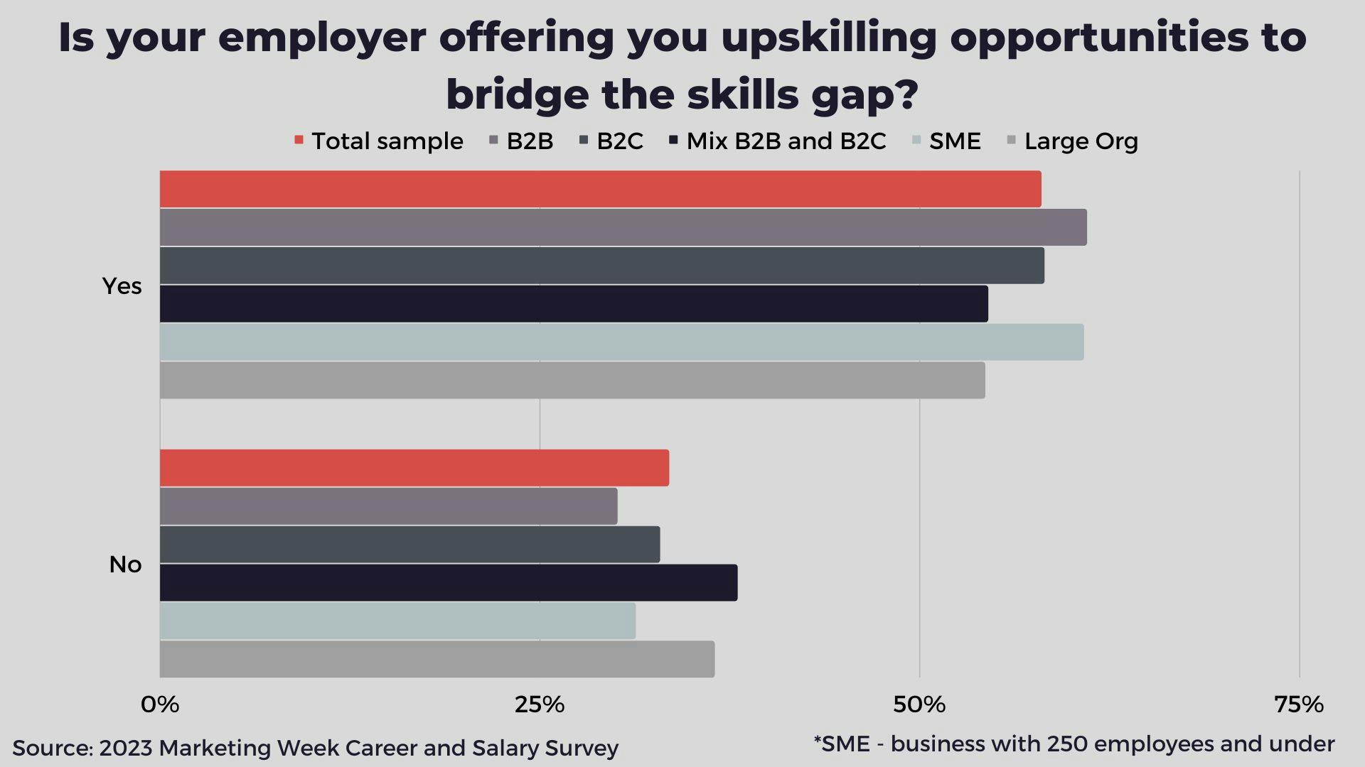 Upskilling is critical for businesses looking to bridge any gap in capability. However, according to Marketing Week’s 2023 Career and Salary Survey, a third (33.5%) of the 3,000-plus marketers that responded are not being offered the opportunity to upskill.