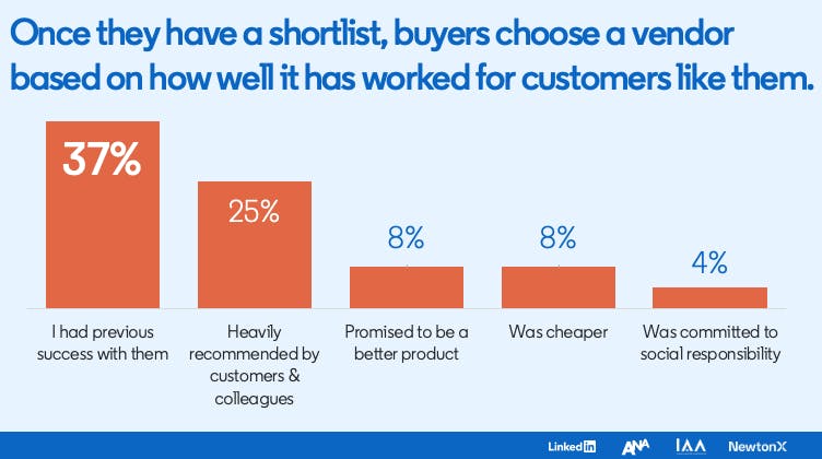 With marketing professor Marcus Collins, the ANA, the IAA, WARC and Newton X, we looked at what really makes B2B products buyable, what influences confidence and what are the emotional jobs to be done that have to be satisfied before buyers feel confidence to buy. We found that, as buyers get closer to making a decision, their reliance on relatability, reputation and validation increases and the importance of product and pricing falls away.