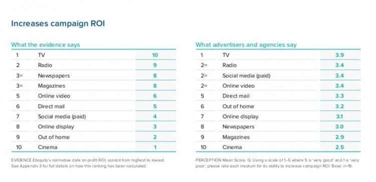 For return on investment (ROI) there is, at least, a much closer correlation between perception and performance. Echoing other research from other independent sources, it is clear that digital media in general gets far too much credit for delivering an ROI versus its actual performance.