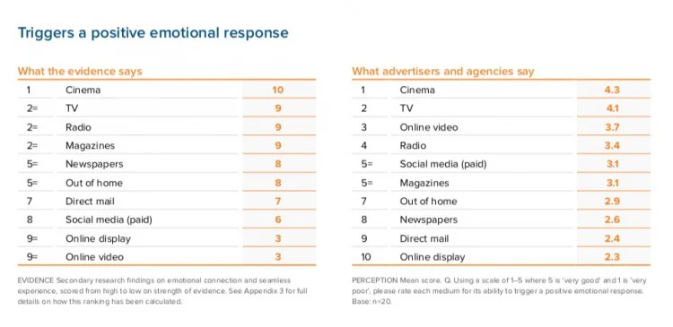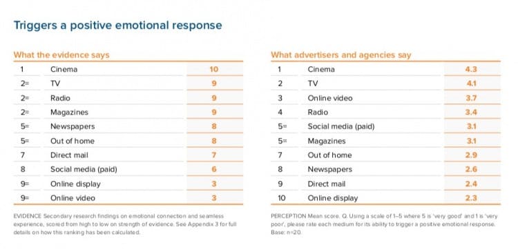The interesting disparity comes with online video. Clearly, those investing in the medium believe it vies with the big traditional screens for emotional depth and engagement but, as the ebiquity research shows, the small screen, fleeting attention and often distracting context for consumption lead to it performing dead-last in terms of generating an emotional response.