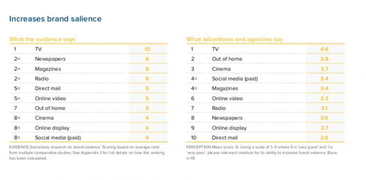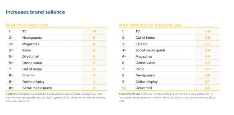 But it’s the evidence-based performance table that should stun marketers. TV retains its dominant position; it’s worth underlining that point given we continue to face dreary marketers getting on stages in their hoodies predicting the end is nigh for TV. But then look at the next top performers according to the actual performance data.