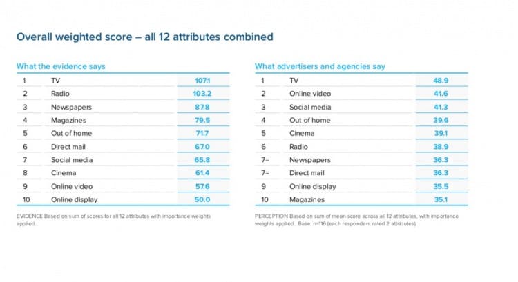 For the team at Thinkbox, there should be genuine celebration that their concerted and extraordinarily data-driven campaign to push the ROI of TV has worked brilliantly. Similarly, the Radiocentre campaigns to push the return on radio advertising appear to have worked. This is not the attribute they need to focus on any more – many other perceptual shortfalls must be corrected.