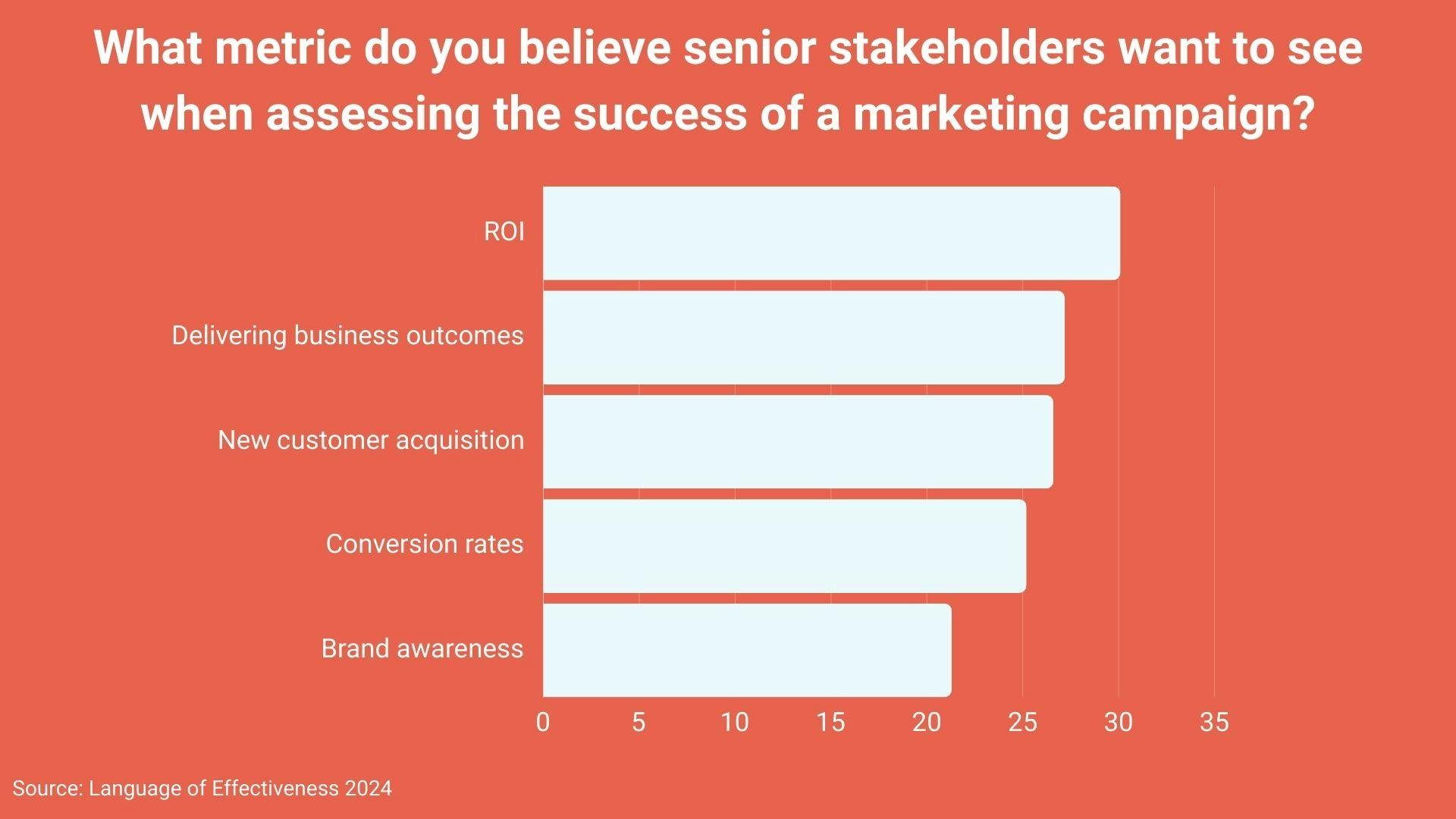 When asked to name the three most important metrics among their senior stakeholders last year, 41.6% of the 2,000+ brand-side marketers surveyed included ROI. In 2024, that figure has tumbled to 30.1%.