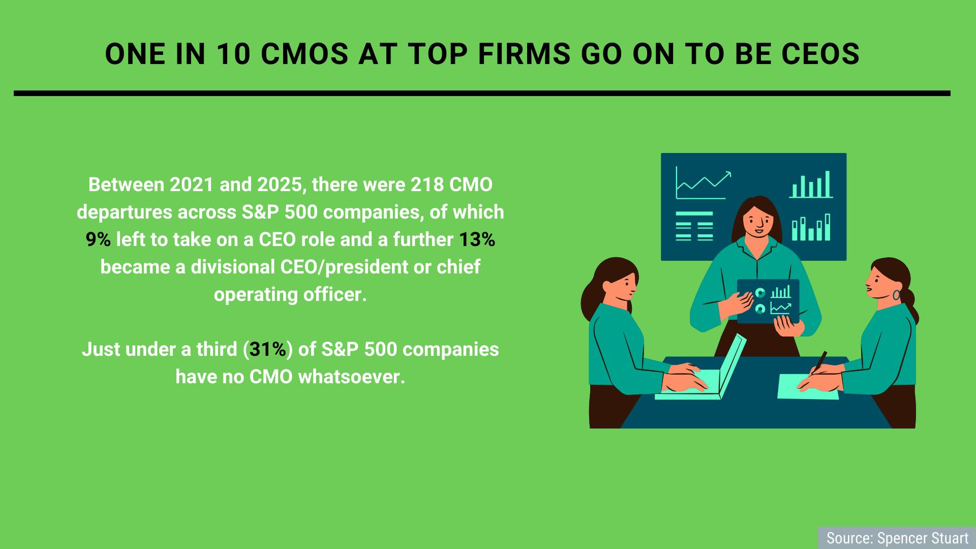 Around one in 10 CMOs who have departed their roles go on to become CEOs, according to analysis from leadership advisory firm Spencer Stuart.
