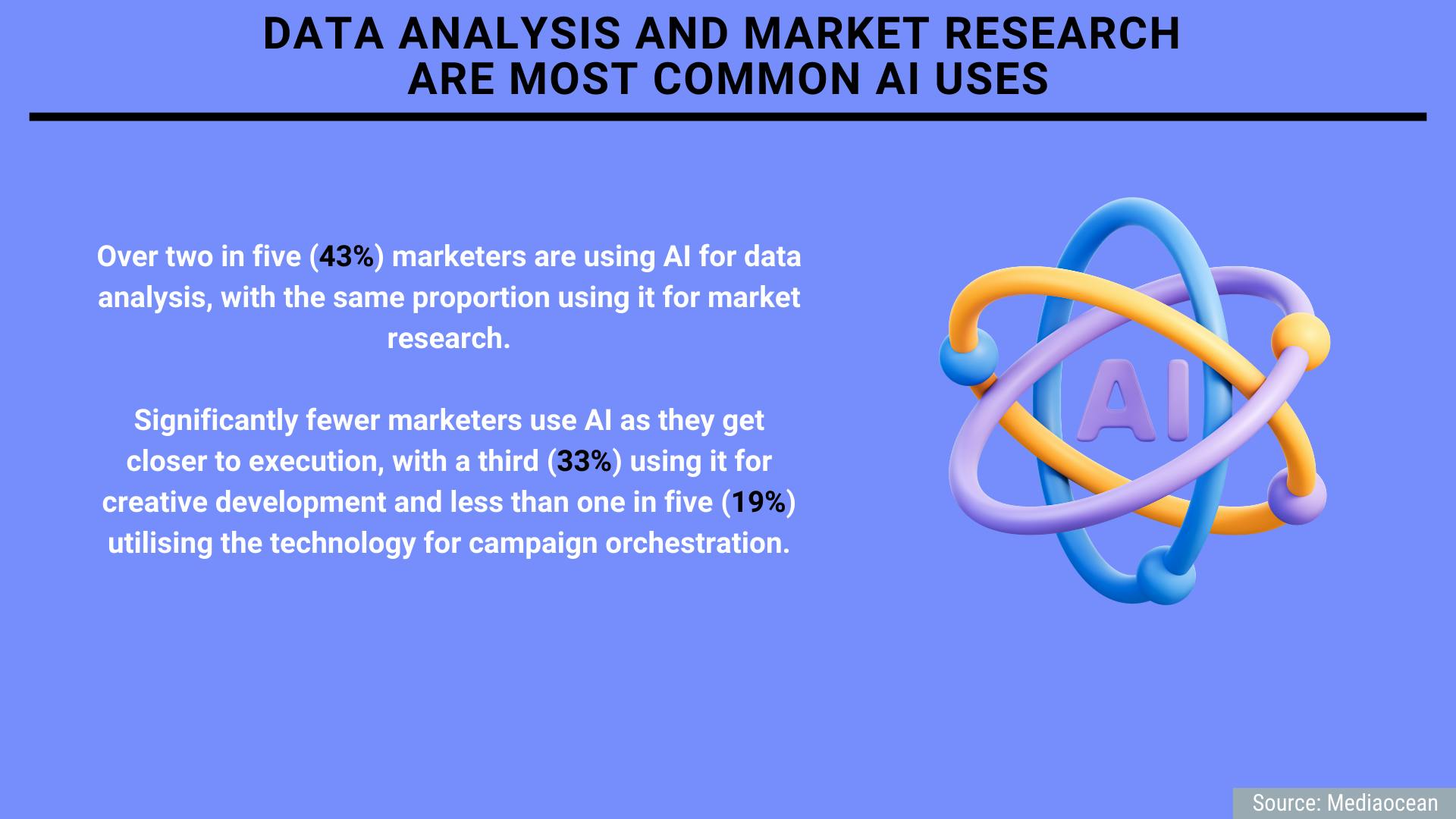 However, when it comes to adoption of AI in their own work, marketers are much more likely to use it for research rather than in execution. Over two in five (43%) marketers are using AI for data analysis, with the same proportion using it for market research.