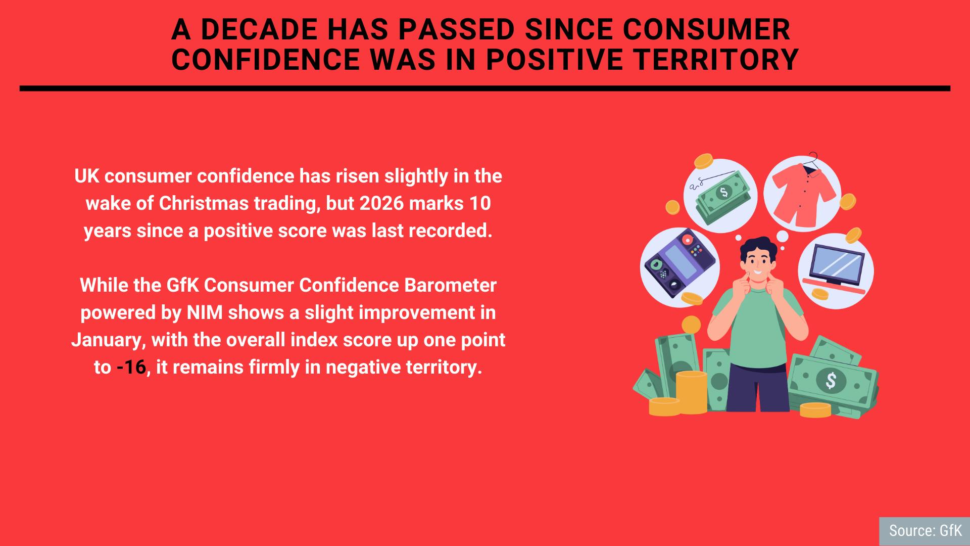 UK consumer confidence has risen slightly in the wake of Christmas trading, but 2026 marks 10 years since a positive score was last recorded.