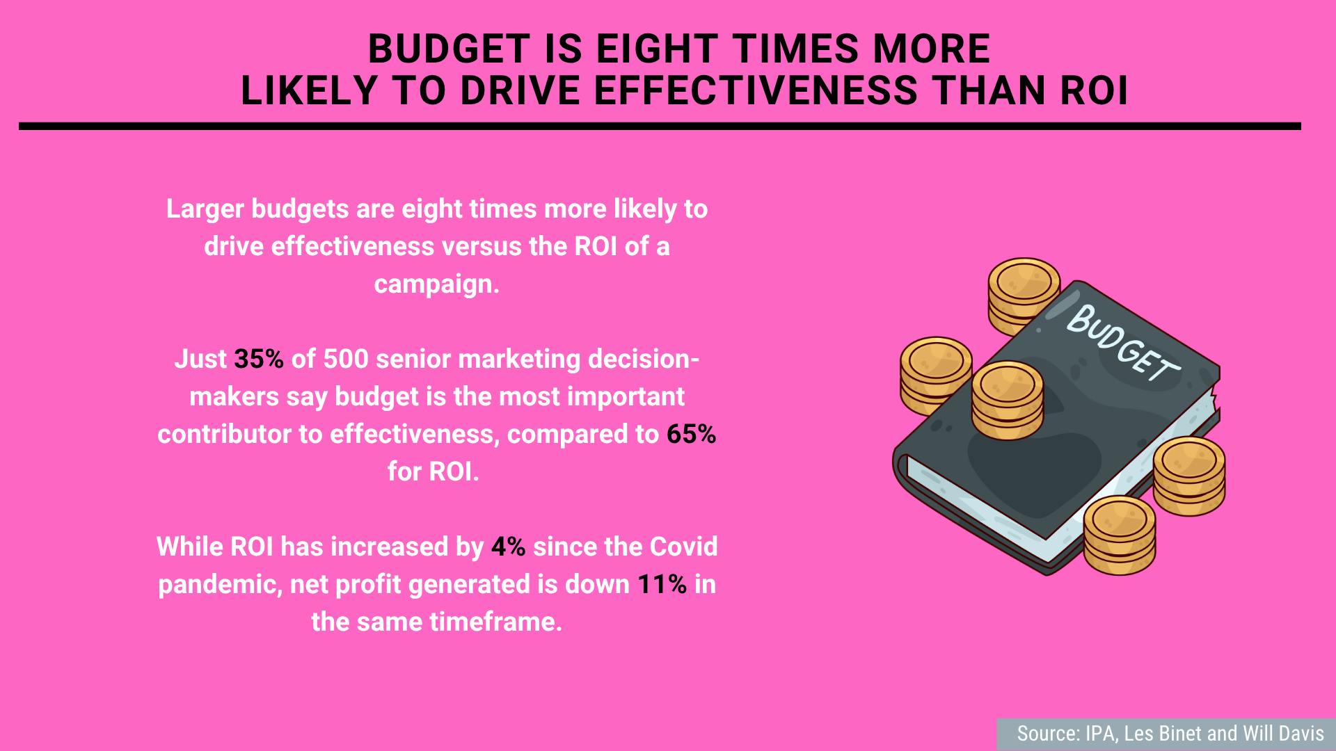The researchers analysed winning IPA Effectiveness Award case studies, and found that ROI only accounts for 11% of the variations in profit payback observed, compared to 89% for budget. This means that larger budgets are eight times more likely to drive effectiveness versus the ROI of the campaign.
