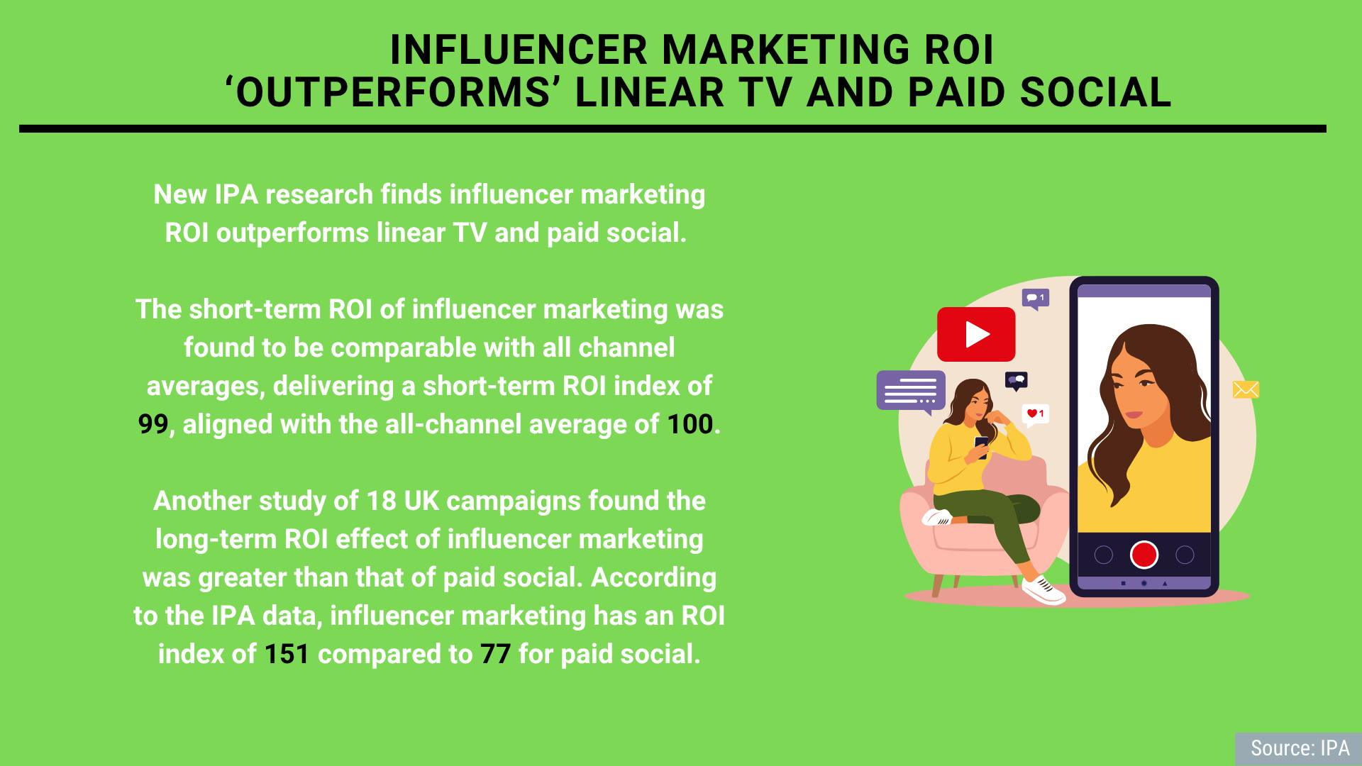 New IPA research finds influencer marketing ROI outperforms linear TV and paid social, delivering “strong returns particularly over the long term”.