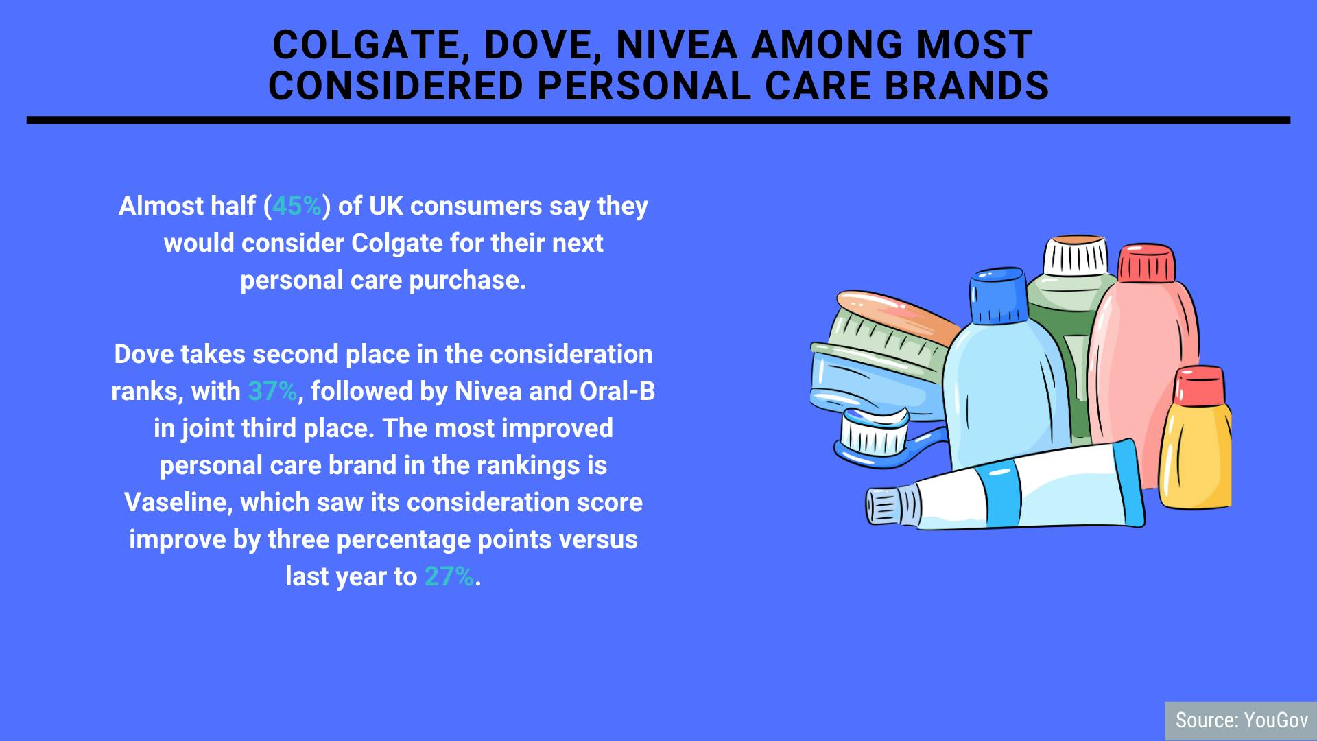 Colgate is the most considered personal care brand in the UK, according to YouGov. Almost half (45%) of UK consumers say they would consider Colgate for their next personal care purchase.
