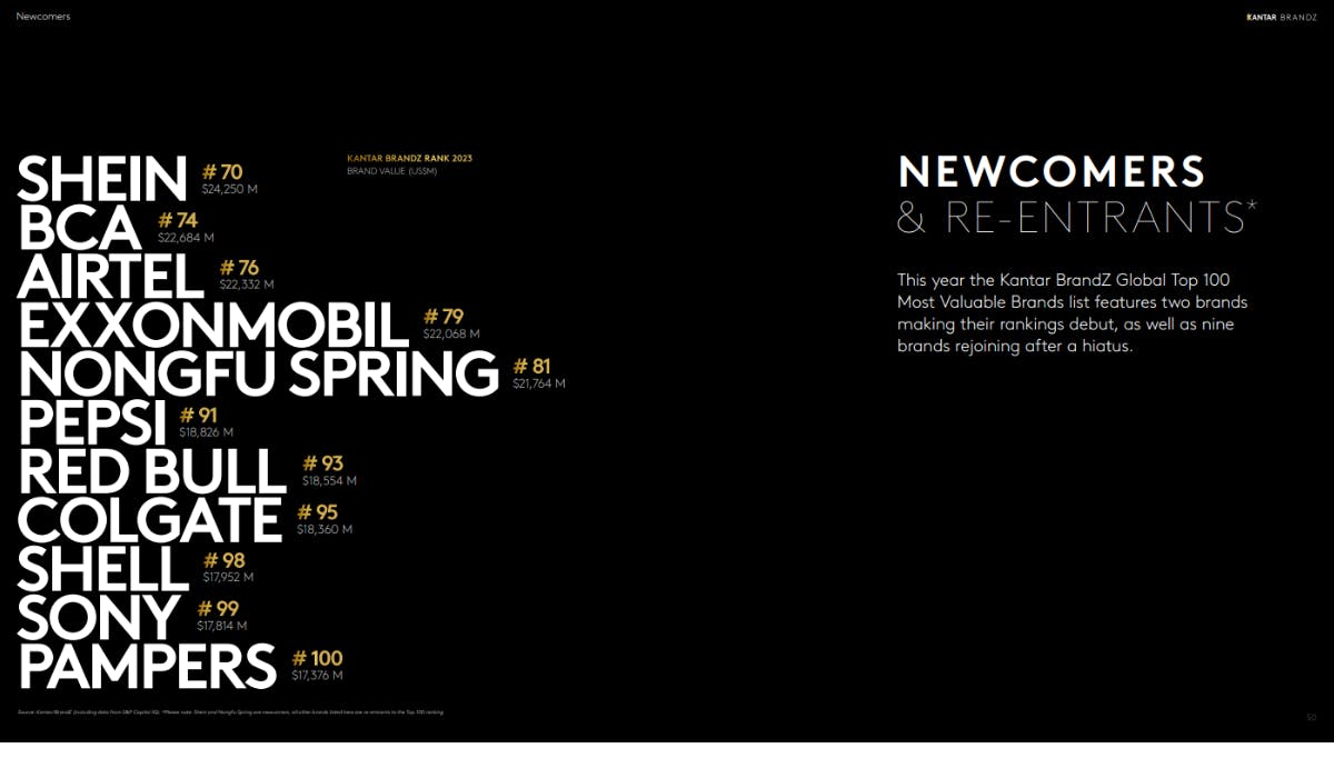 Pepsi re-enters the top 100 this year in the 91st spot with a brand value of $18.8bn, a year-on-year increase of 17%. Colgate also joins the top 100 at 95 ($18.3bn, up 1%), alongside Sony at 99 ($17.8bn, N/A), and Pampers at 100 ($17.3bn, down 12%).