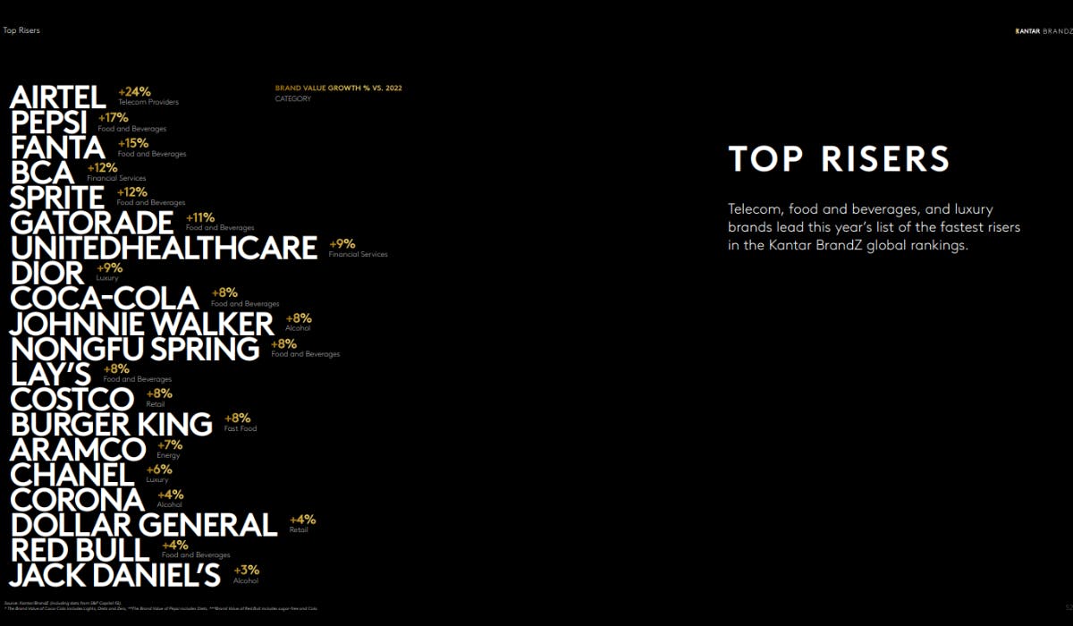 Coca-Cola comes in 10th, re-entering the top tier for the first time since 2015 with a brand value of $106bn. This is up 8% from $98bn last year, making it one of just 16 brands in 2023’s top 100 to grow at all in the past year.