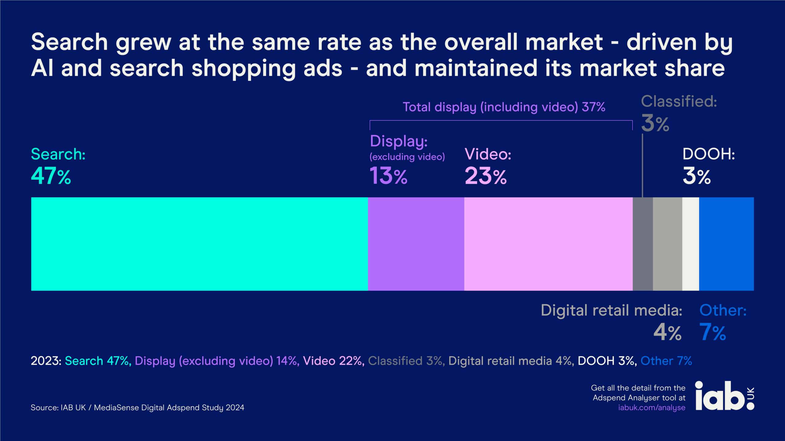 However, search remains on top. Almost half (47%) of all digital ad spend in 2024 focused on search, representing a 13% year-on-year increase to £16.6bn.