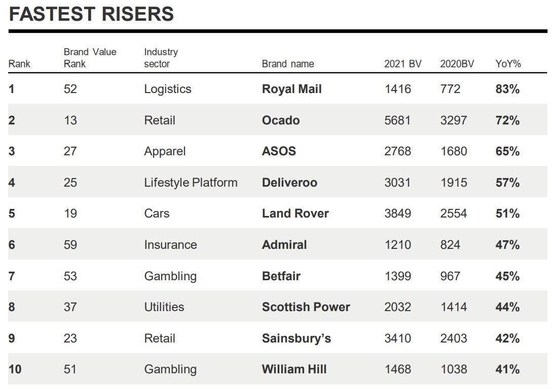 Royal Mail’s brand value has increased by 83% pushing it to 52 in the ranking and making it the UK’s fastest riser this year. Ocado is not far behind, rising 72% to 13, followed by Asos (up 65% to 27) and Deliveroo (up 57% to 25).