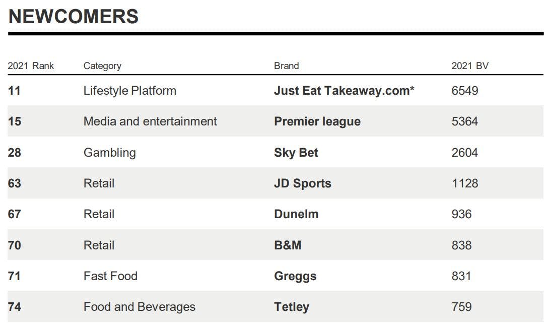 Meanwhile, Sky Bet has entered the ranking for the first time, jumping straight in at 28. The Premier League is another new entry, joining the ranking at 15.