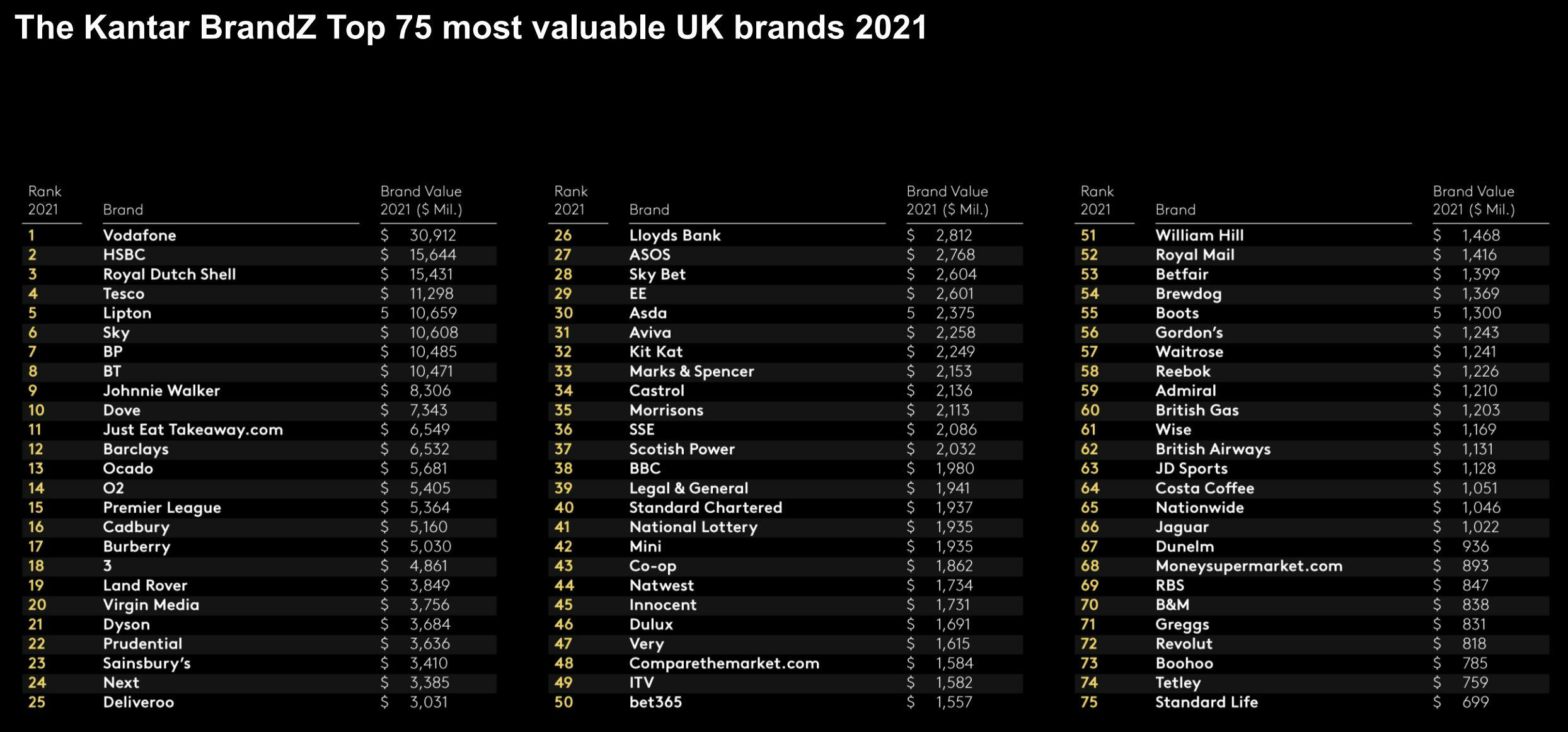 While Vodafone ($30.9bn), HSBC ($15.6bn) and Shell ($15.4bn) retain their positions in the top three spots for 2021, Tesco ($11.3bn) has leapfrogged four brands to jump into 4th place, after seeing its brand value rise 33% over the past year.