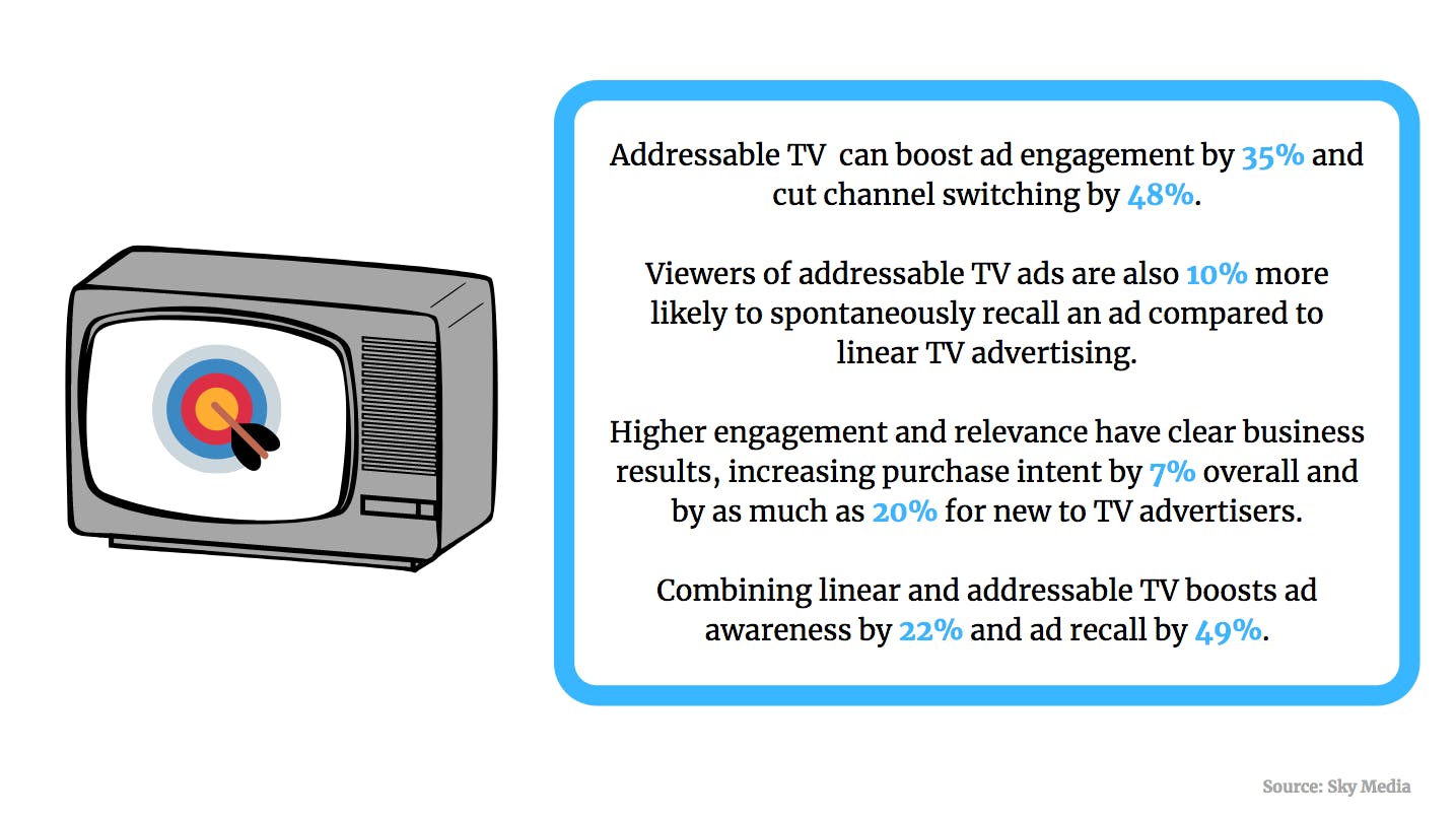 Addressable TV – the ability to show different ads to different households while watching the same programme – can boost ad engagement by 35% and cuts channel switching by half (48%). Viewers of addressable TV ads are also 10% more likely to spontaneously recall an ad compared to linear TV advertising.