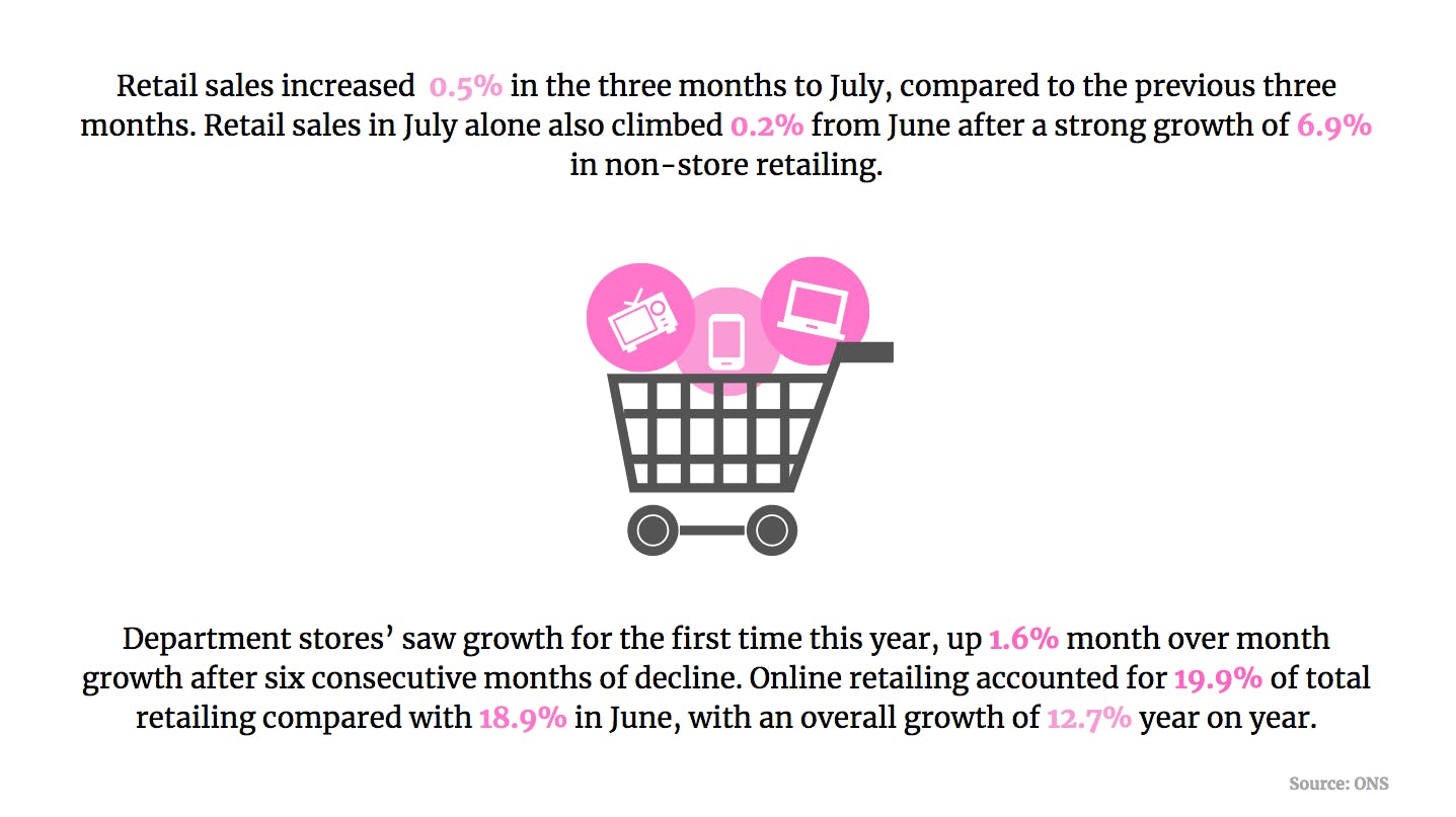 Online retailing accounted for 19.9% of total retail sales in July, compared with 18.9% in June. Online sales were up 12.7% year on year.