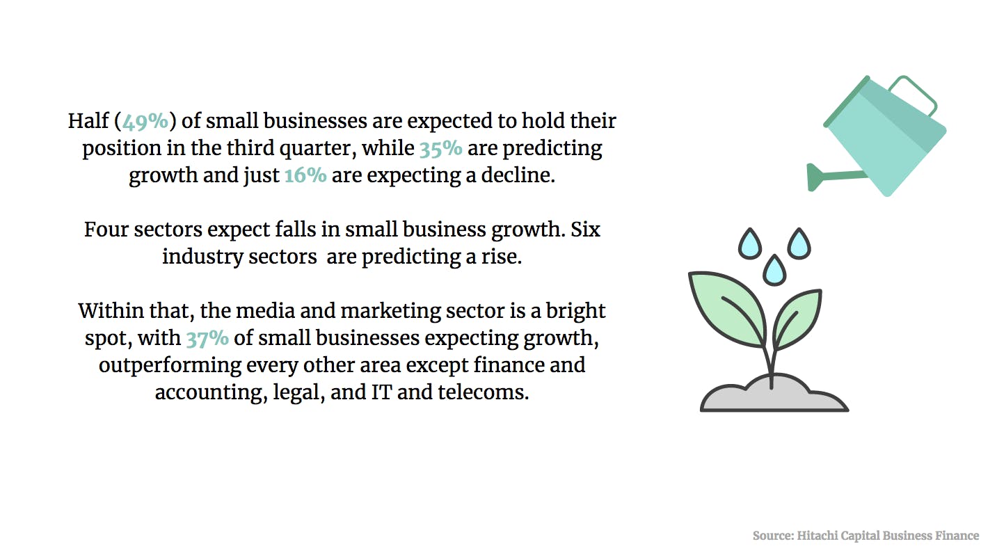 Within that, the media and marketing sector is a bright spot, with 37% of small businesses expecting growth, outperforming every other area except finance and accounting, legal, and IT and telecoms.