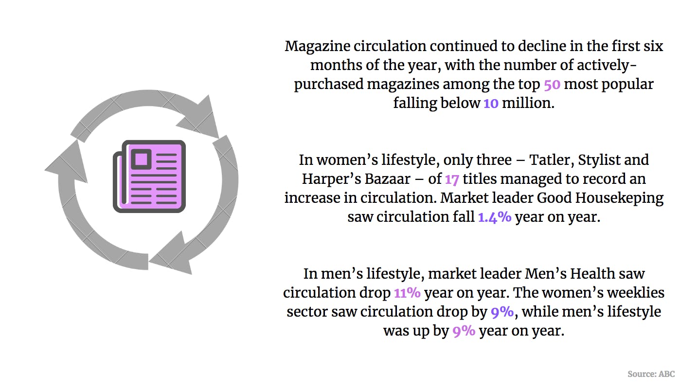 In men’s lifestyle, market leader Men’s Health saw circulation drop 11% year on year, while GQ and Esquire also saw circulation tumble. Women’s weeklies continue to decline with sales down 9% and Take a Break down 8.4%, although it continues to lead the market.