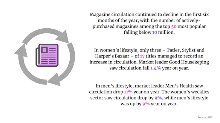 Magazine circulation continued to decline in the first six months of the year, with the number of actively-purchased magazines among the top 50 most popular falling below 10 million