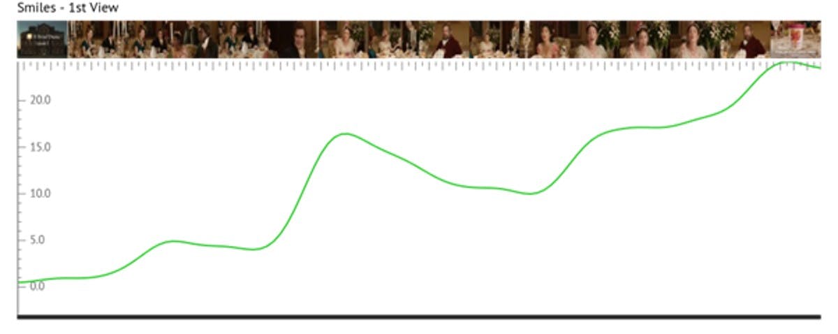 Kantar’s facial coding chart (below) reveals where people smile as they view the ad for the first time, with peaks coinciding with moments of overt humour – notably when one of the women says she is in a “bloody mess down there”, the overexaggerated reactions of shock from the men in the room, and when one woman says Here We Flo’s tampons are compostable, so the gardener can “bury them in your rose bush”.