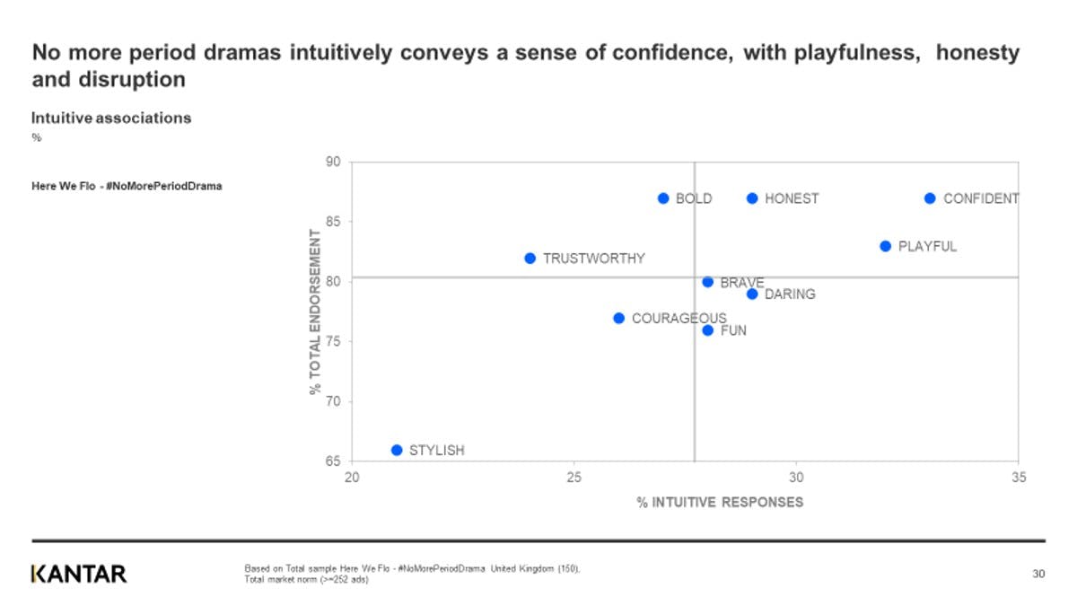 However, using the speed of response technique, The Works reveals the ad is “hitting the sweet spot” in terms of conveying Here We Flo’s intended brand values, which are to help people feel positive around their body’s “messiest moments” and eradicate shame.