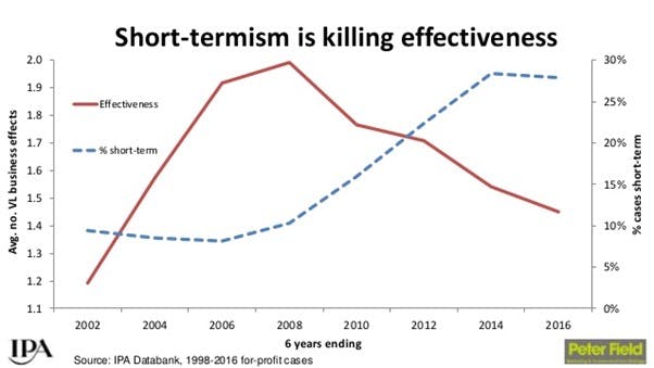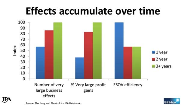 But TLATSOI was something different, something special. Field and Binet had begun to tease out the short-term flaws of marketing theory in earlier work, but the data had not been available to make any strong conclusions. Funding from Thinkbox and access to the IPA’s database of award submissions offered the duo a chance to properly examine the balance of long-term and short-term thinking.