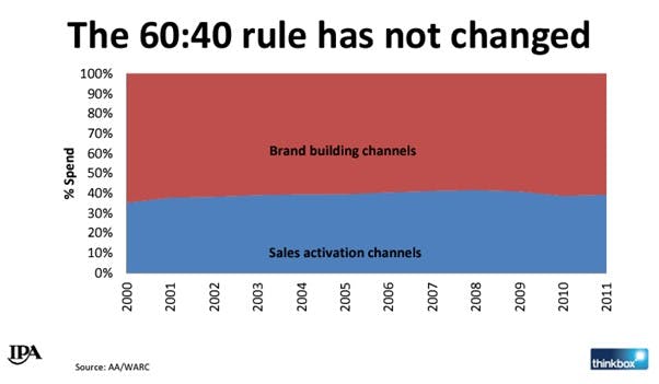 These days, most trained brand managers are aware of these sensitivities, while most untrained ones rail against the generic 60:40 balance as being too generic and prescriptive – which of course it is. But the advantage and attraction of this oversimplistic ratio is that it provided marketers with a priori guidance towards what a good long-term brand-building investment should look like for their brand. Many did not reach those heady levels, but it became a lighthouse that pulled extraordinary numbers of brands away from the siren song of short-term overinvestment.