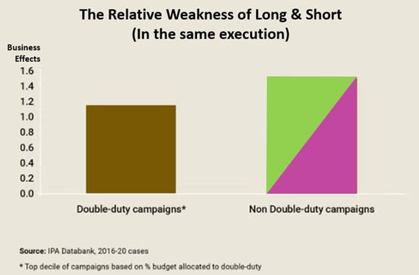 The original interpretation of double-duty ads and their failure to do as well as long, brand-building ads and separate, short, activation ads suggested a symmetry in which long-term advertising just does brand building and short-term activation advertising just does sales. The greyness of the long and the short meant there was likely to be a little bit of overspill, as noted above, but not that much.
