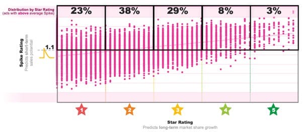 The ads performing above a 1.1 spike rating (in the top half of the chart) are deemed above average in their potential to drive short-term sales. But look at their horizontal location, which indicates their long-term brand building capabilities. If long and short were possible within the same ad, to the same degree as separate long and short ads, we would expect to see an even distribution of good short-term campaigns across each of the stages of the star rating. Or about 20% of the above-average spike-rated campaigns in each of the star rating boxes along the top.
