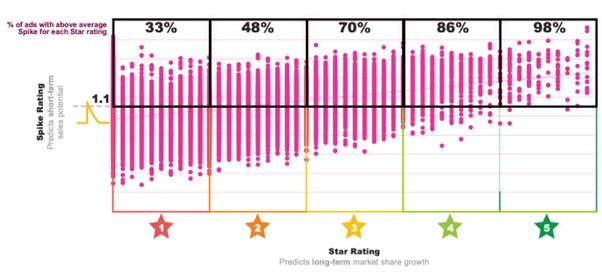 And that is a story we see played out consistently across most ads aimed at delivering short-term activation. In the chart above you can see the SCS ad along with more than 18,000 others (the little pink dots) distributed vertically up and down the Y-axis measure of their short-term spike rating and horizontally across the X-axis measure of their long-term star rating.