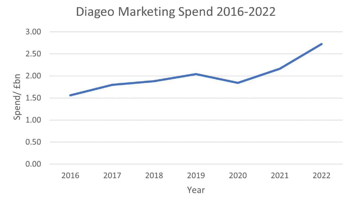 Yet, by 2021 Diageo had restored marketing spend to £2.2bn, above pre-pandemic levels, even as many on-trade premises remained closed due to ongoing national lockdowns around the world. Between 2020 and 2022, spend rose by 48%.