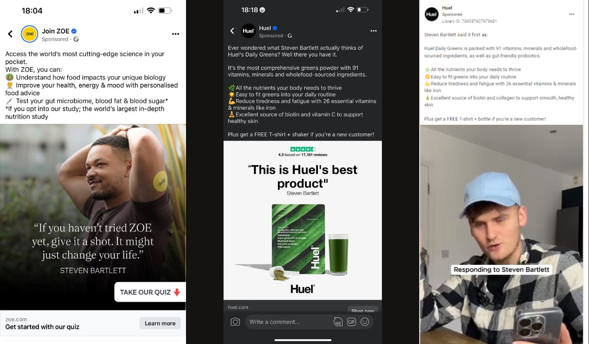 The ad for health tech startup Zoe, published on Facebook, featured a quote from Bartlett stating: “If you haven’t tried Zoe yet, give it a shot. It might just change your life”. Similar ads for Huel featured testimony from the Diary of a CEO podcast host declaring “This is Huel’s best product” and “This is the best product that Huel have released”.