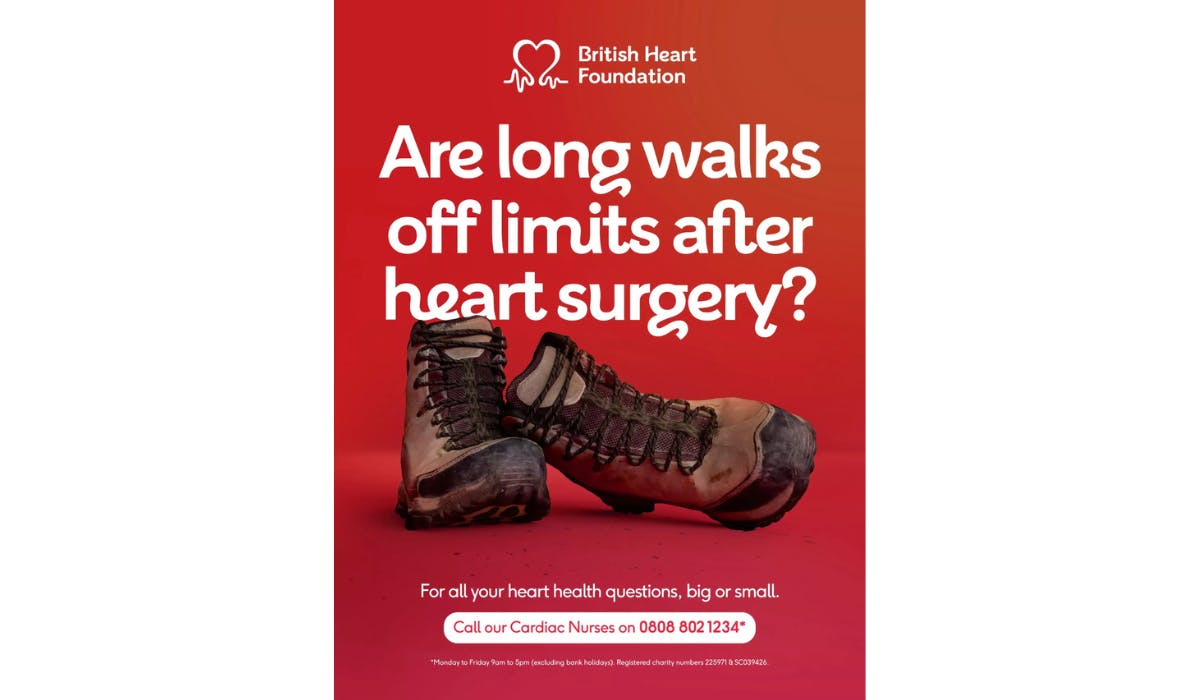 The BHF print ad asks, “Are long walks off-limits after heart surgery?” in white text on a red background. Below the question, a pair of walking boots is displayed, while prompts to call its cardiac nurses for health questions “big or small” are positioned at the bottom.