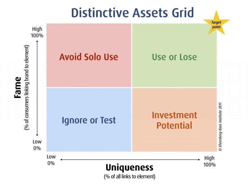 The consumer research tested more than 400 brand elements from brands across different categories. The strength of these elements were determined across the two vectors of fame and uniqueness.
