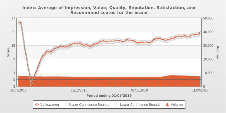 On 1 September 2015, just before Dieselgate broke, the brand had a score of 25.3; this then dropped significantly to a low of -1.6 on 18 December 2015. Since then, its brand has been in recovery, and on 1 September had a score of 20.5, well up on the lows but not yet back at its previous score.