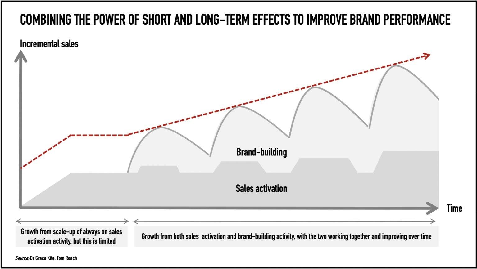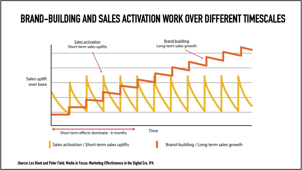 Strategist and effectiveness champion Tom Roach and I reviewed 20 years’ worth of past projects and found that message holds up, but the real world teaches other lessons too. One is that many brands get years of significant growth by scaling up short-lived sales activation. Another is that following the orange line in the famous chart is not profitable for some advertisers and too risky for many others.
