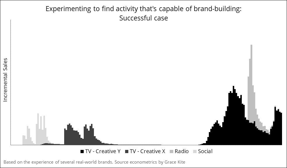 Some, like the advertiser in the chart above, do eventually find the right combination of creative and media channel. In the chart, initial experiments with social only had a short-lived effect and TV creative X was not strong enough to produce a long-lasting effect.
