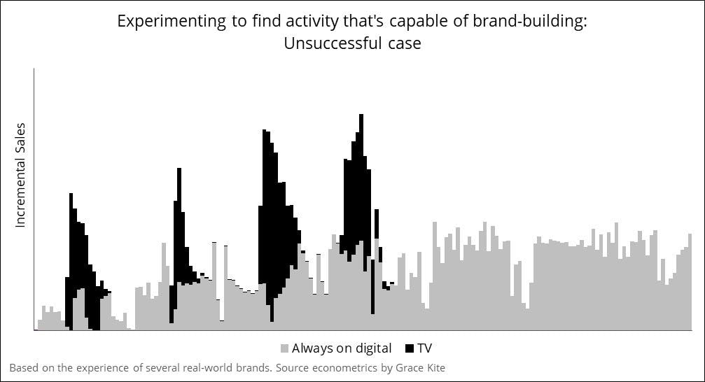 The third set of examples in our past projects is advertisers whose experiments with brand-building don’t initially work. They either don’t turn out to have long-lived effects or don’t offer a positive return on investment.