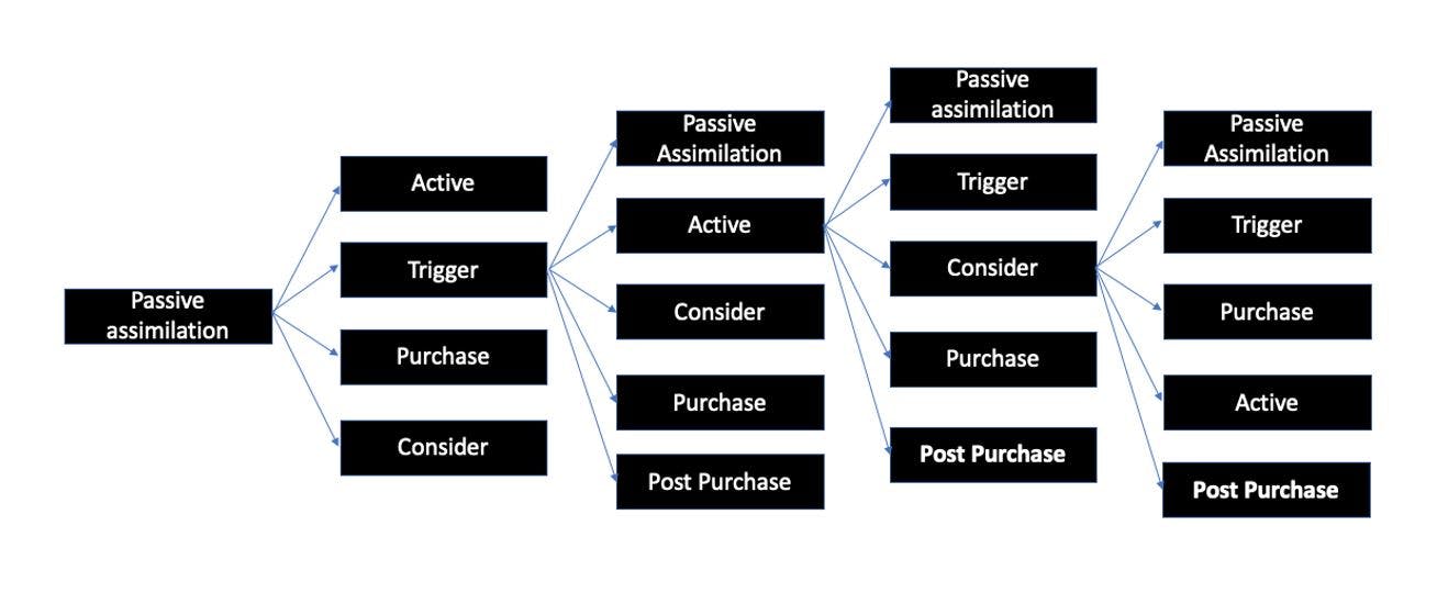 The biggest difference being that the hexagon leaves all paths open rather than forcing you through the messy middle. Someone could travel from passive assimilation to purchase immediately, no middle at all with zero behavioural evidence that you’ve been triggered or explored or evaluated.