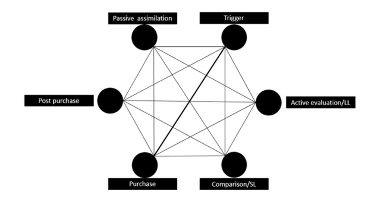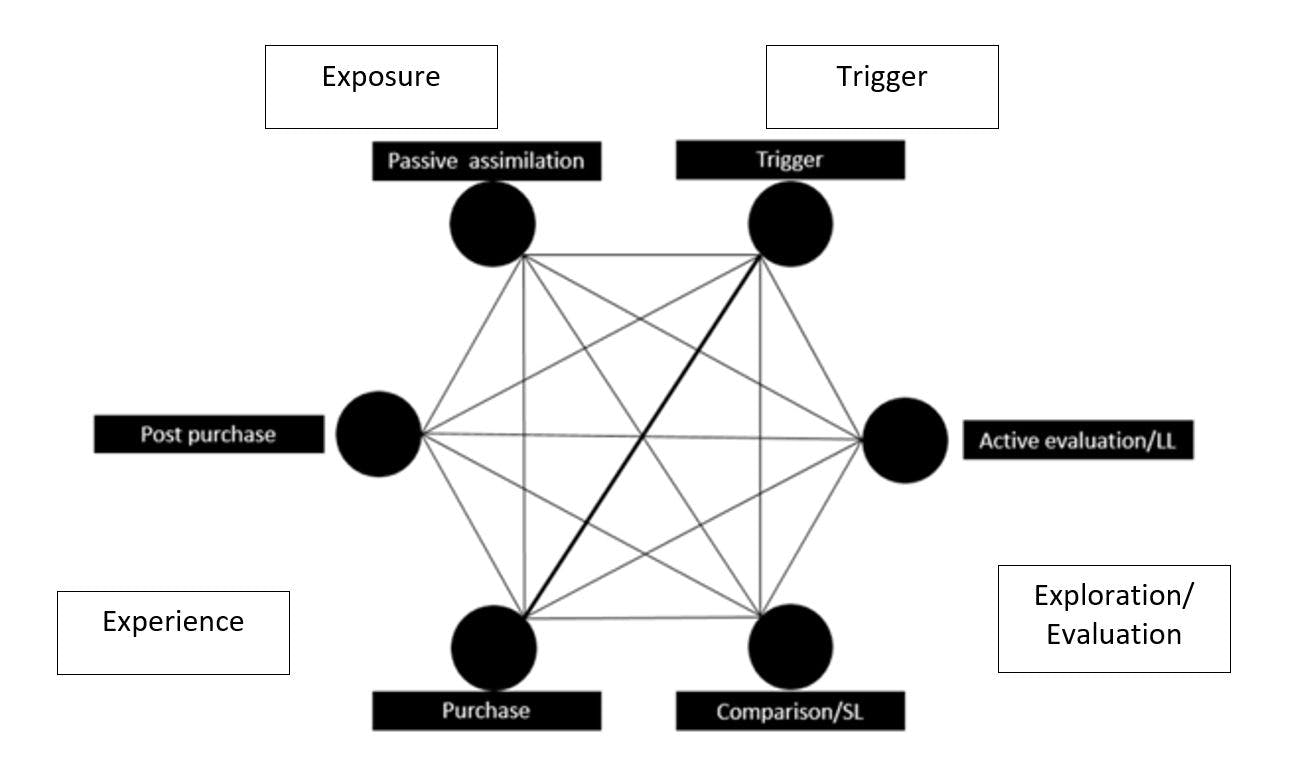 This interlinked model allows all points to be connected to all potential decision nodes. The benefit being there are no pre-formulated pathways or directions. As each node is linked to every other node this theoretically represents a vast number of potential paths to purchase.